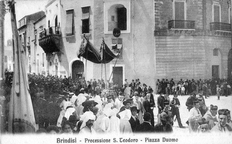 In passato san Teodoro veniva celebrato due volte l’anno, il 9 di novembre a ricordo del martirio, e il 27 aprile giorno della traslazione da Euchaita. Secondo la tradizione più remota quest’ultima circostanza risalirebbe al 1210 o più probabilmente al 1225, in occasione delle nozze di Federico II di Svevia con Isabella di Brienne, regina di Gerusalemme, celebrate il 9 novembre nella Cattedrale di Brindisi. In entrambe le ricorrenze le reliquie venivano portate “processionalmente per la città con il concorso de’ cittadini tutti, e forastieri” (A. Della Monaca). Nella Cronaca dei Sindaci di Brindisi sono registrate scrupolosamente le volte in cui i festeggiamenti civili e religiosi in onore del santo non avvenivano o si verificavano in modo differente dal solito, come accadde il 27 aprile del 1698, quando un forte acquazzone che durò l’intera giornata non permise lo svolgimento della processione, “ma solamente si fece d’intorno la chiesa dell’arcivescovato”. Nell’aprile del 1727 si svolse solo il rito religioso in cattedrale, mentre tre eminenti cittadini, Teodoro Sala, Tommaso Cantamessa e Domenico Sciurbi, organizzarono una sfilata con circa sessanta persone a cavallo, armati di “carrubini” e pistole, che sfilarono ben vestiti in città, ottenendo un’ottima impressione tanto che la processione “a gloria del nostra santo, riuscì più bella delle altre volte”. I sacrestani della cattedrale ebbero in elemosina olio così da poter illuminare la piazza e le vie circostanti, e denaro per comprare la polvere da sparo per i cento mortaretti “con molti folgoroni”, esplosi poi la sera.