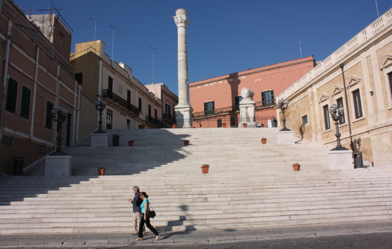Passano 132 anni, i rocchi rimangono lì, non sono spostati fino al momento in cui il sindaco Carlo Stea (in carica dall’uno settembre 1657 al 31 Agosto 1658 ) in un momento di forte esaltazione religiosa decide di offrirli alla città di Lecce, per onorare il patrono S. Oronzo il quale avrebbe liberato la nostra Provincia dalla peste del 1656. A questo proposito, sempre in base alla già citata Cronaca il canonico Pasquale Camassa nella sua opera “La romanità di Brindisi attraverso la sua storia e i suoi avanzi monumentali”, edito a Brindisi nel 1934, afferma quanto segue : “L’idea per quanto lodevole dal lato religioso, trovò una forte opposizione nella cittadinanza, la quale non sapeva adagiarsi all’idea di essere privata di quei marmi, muti testimoni della sua antica grandezza. Quei blocchi marmorei, dicevano i Brindisini, dovranno essere rimessi sulla loro antica base. Il sentimento religioso non deve distruggere l’altro pur nobile sentimento della conservazione dei patrii monumenti. I sindaci Cuggiò, Monticelli e Vavotico non vollero mai ratificare l’atto di cessione compiuto dal loro predecessore Stea. Dopo anni di opposizioni il Vicerè Conte di Castrillo, ordinò che i pezzi della colonna fossero ceduti a Lecce. Se è vero che Brindisi si oppose alla cessione della sua colonna, per il rispetto che sentiva per i suoi monumenti, non è più conforme alla verità storica il sostenere che l’abbia donata. A tal proposito Andrea della Monaca nella sua “Memoria Historica” (1674) a proposito dell’elezione del Sindaco, elenca i compiti demandati all’amministrazione ed evidenzia come nelle deliberazioni egli non abbia voto; illustra le incombenze e l’esercizio del Sindaco, il quale, in atti, non poteva concedere né donare senza deliberazione decurionale del Pubblico Reggimento (cioè il Consiglio Comunale).
