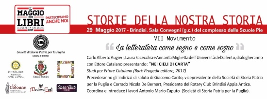La sezione di Brindisi della Società di Storia Patria per la Puglia in uno con In_Chiostri, Rotary Club Brindisi Appia Antica e l’adesione dell’Associazione Le Colonne, organizza, nell’ambito di Maggio dei Libri, Storie della nostra storia, occasione di incontro tra chi legge e chi scrive, tra chi ama imparare a leggere e chi ama imparare a scrivere.