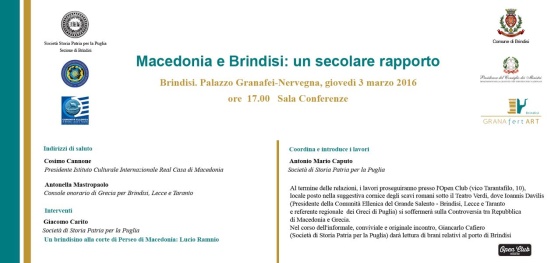 Al termine delle relazioni, i lavori proseguiranno presso l’Open Club (vico Tarantafilo, 10), locale posto nella suggestiva cornice degli scavi romani sotto il Teatro Verdi, dove Ioannis Davilis (Presidente della Comunità Ellenica del Grande Salento – Brindisi, Lecce e Taranto e referente regionale dei Greci di Puglia) si soffermerà sulla Controversia tra Repubblica di Macedonia e Grecia. Nel corso dell’informale, conviviale e originale incontro, Giancarlo Cafiero (Società di Storia Patria per la Puglia) darà lettura di brani relativi al porto di Brindisi. La scelta comprende versi di Franco Calderaro (da Viersi ‘rranciati, Brindisi: Tipografia Roma, 1931), Giovanni Guarino (da Puisii, Brindisi: Mealli, 1933 e Mellonata, Brindisi: Tipografia Durano, 1933), Pasquale Camassa (Un brindisi a Brindisi, pro manuscripto).