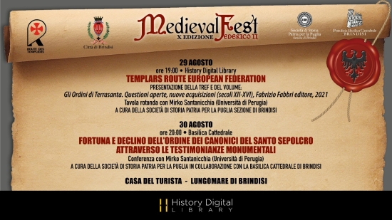 Il 29 agosto, nella Casa del Turista, oggi sede di History Digital Library, saranno presentati la TREF (Templars Route European Federation) e il volume: Gli Ordini di Terrasanta. Questioni aperte, nuove acquisizioni (secoli XII-XVI), atti del convegno internazionale (Perugia, Novembre 2019), a cura di A. BAUDIN, S. MERLI, M. SANTANICCHIA, Perugia, Fabrizio Fabbri editore, 2021. Intervengono LEONARDO VARASANO, Assessore alla Cultura del Comune di Perugia e vicepresidente della TREF; MIRKO SANTANICCHIA, membro del Comitato scientifico della TREF; MASSIMO VITALI, assessore alle attività produttive del Comune di Brindisi, EMMA TAVERI, .assessore al Turismo, Marketing Territoriale e Creatività del Comune di Brindisi, CRISTIAN GUZZO, T.EODORO DE GIORGIO, GIUSEPPE ROLLO, GIUSEPPE MARELLA, della Società di Storia Patria per la Puglia.