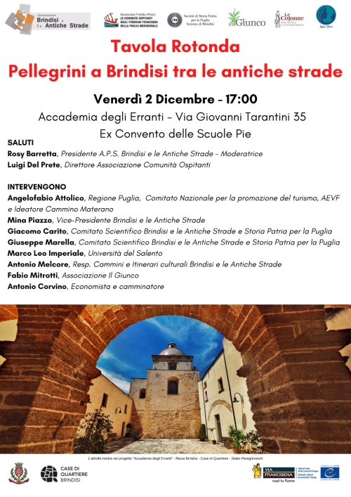 La Società di Storia Patria per la Puglia – Brindisi. Brigata Amatori Storia e Arte, organizza la tavola rotonda dal titolo Pellegrini a Brindisi tra le antiche strade per venerdì 2 dicembre, alle ore 17.00, nella sala conferenze dell’Accademia degli Erranti – Statio Peregrinorum, la Casa di Quartiere, che ha sede in Via Giovanni Tarantini, 35 (Ex Convento delle Scuole Pie).