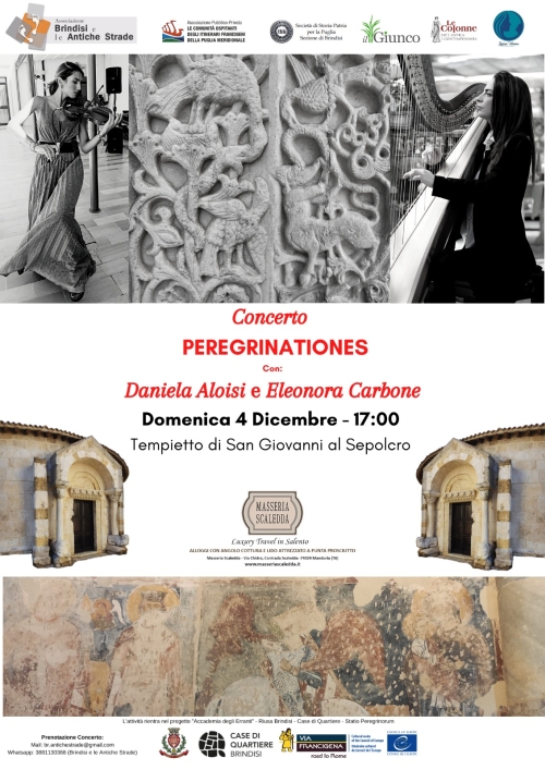 Domenica 4 dicembre, alle 17.00, nella suggestiva ed evocativa cornice del tempio del Santo Sepolcro, si terrà il concerto “Peregrinationes” con le musiciste Daniela Aloisi al violino ed Eleonora Carbone all’arpa. Il concerto è dedicato al viaggio, al pellegrinare come esperienza interiore.