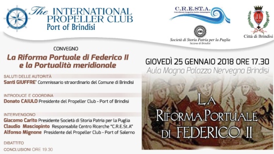 La quinta tappa del tour dei porti federiciani volta a esporre le vicende degli undici scali scelti da Federico II per l’export dei prodotti agroalimentari del Regnum Siciliae, approda a Brindisi grazie alla partnership tra Propeller Club – Port of Brindisi, Comune di Brindisi, Società di Storia Patria per la Puglia – Sezione di Brindisi e C. R. E. St. A. (Centro Ricerche Etnografiche, Storiche, Antropologiche) Puglia di Bari, nell’occasione offerta dalla presentazione del volume, scritto dall’avvocato salernitano Alfonso Mignone La riforma portuale di Federico II (Ed. La Nuova Mezzina, Molfetta 2017). Interverranno, dopo l’indirizzo di saluto del dr. Santi Giuffrè, Comissario prefettizio del comune di Brindisi. Giacomo Carito, della Società di Storia Patria per la Puglia, Claudio Masciopinto del C. R. E. St. A. e Alfonso Mignone presidente del Propeller Club – Port of Salerno. Introduce e coordina Donato Caiulo, presidente del Propeller Club – Port of Brindisi.