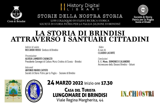 Il sacro percorre ogni angolo di Brindisi e della sua storia; in quanto nodo di importanti strade, le vie Appia e Traiana, Brindisi attrasse a sé molto presto i culti stranieri quale il documentato culto della egizia Iside, Una quantità di ricordi storici che richiamano grandi epoche e nomi illustri sono in questa città tuttora vivi e presenti Nelle sue mura, nelle strette vie e vicoli, nei castelli di mare di terra, si scorgono, murati ma in vista, relitti silenti, per chi vede senza conoscere, del rapporto secolare col sacro.