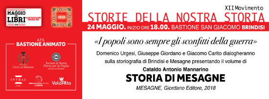 Giacomo Carito, Domenico Urgesi e Giuseppe Giordano, attraverso un dibattito sulla locale storiografia tardo rinascimentale, presenteranno l’opera di Cataldo Antonio Mannarino Storia di Mesagne (Frammenti), nell’edizione curata da Giuseppe Giordano, Domenico Urgesi e Damiano Angelo Leucci (Mesagne: Giordano Editore, 2018).