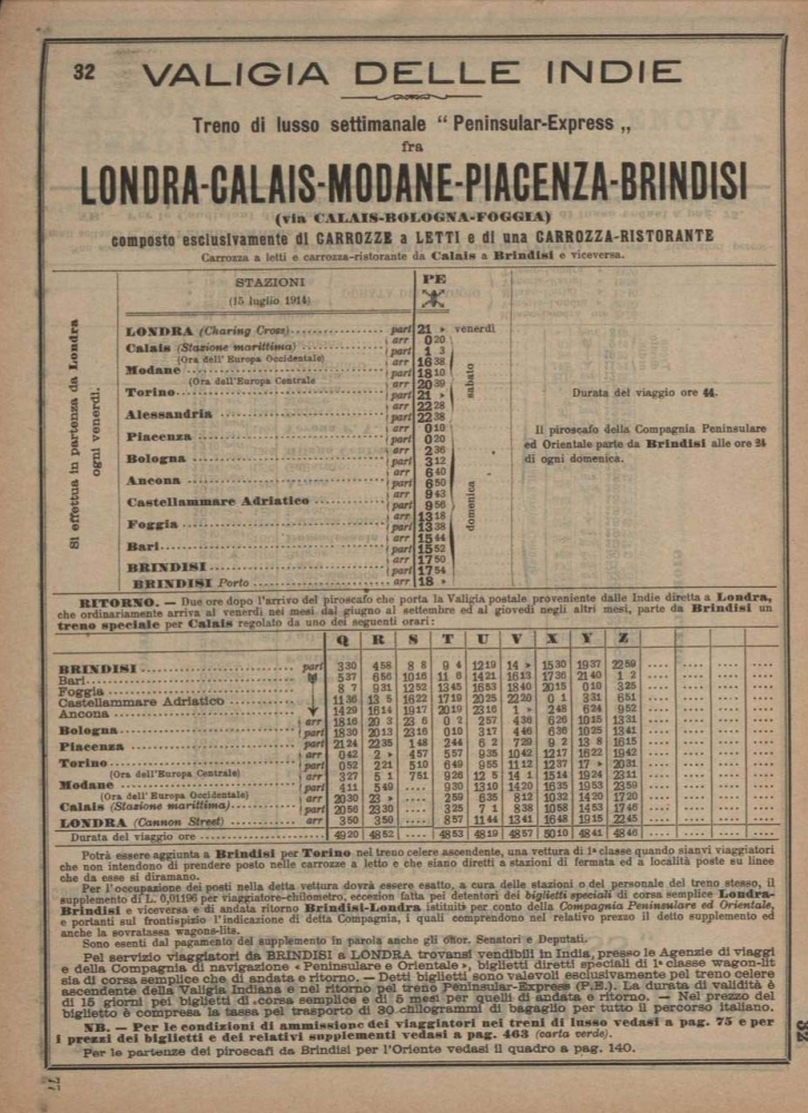 Il convoglio partiva da Londra e in 44 ore si attraversava via terra l’Europa centrale; la partenza dal porto di Brindisi era stabilito per le ore 14 di ogni domenica con arrivo ad Alessandria, quindi Suez, Aden e Bombay. La durata complessiva del viaggio era di 22 giorni contro i 25 impiegati via Marsiglia.