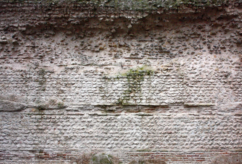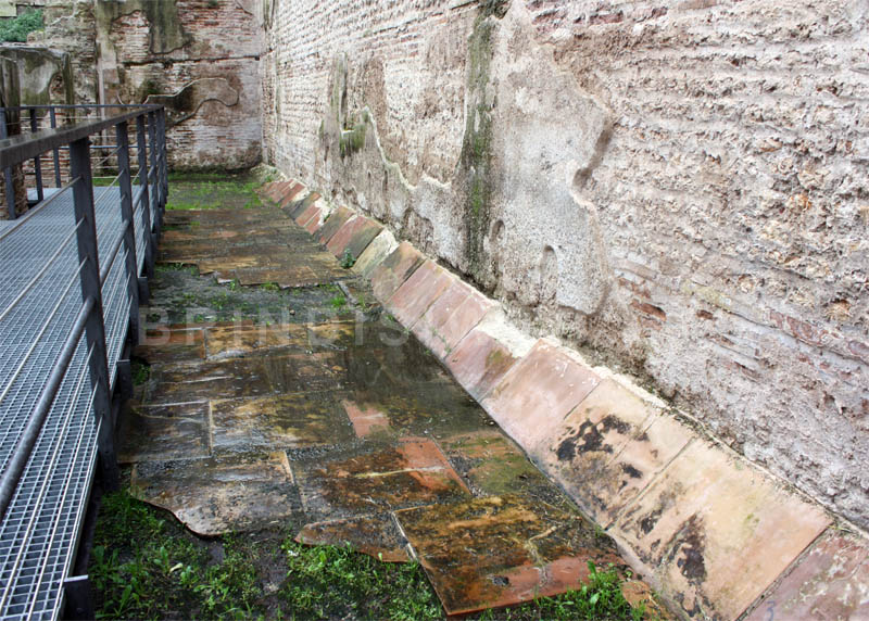 Lungo la base dei muri perimetrali vi sono dei cordoli che servivano ed eludere le infiltrazioni e le perdite d’acqua, ricoperti, nella vasca più grande, dalle lastre della pavimentazione (6). Questi muri sono realizzati con blocchetti irregolari in calcare che si alternano a fasce orizzontali di laterizi.