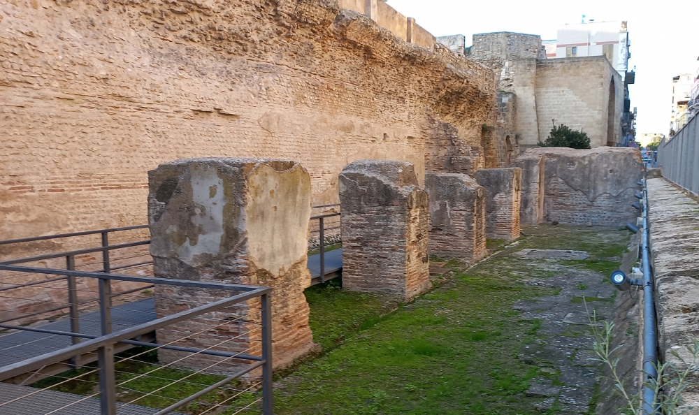La parete perimetrale occidentale a ridosso della cinta muraria, alta poco più di 5 metri, è pressoché lineare, mentre quella opposta (lungo via C.Colombo) presenta due ripiegature verso l’interno a forma quadrangolare, una per ogni ambiente. Questo lato è in buona parte distrutto e si eleva mediamente per circa 1,7 m. Entrambe le pareti perimetrali hanno uno spessore di circa 80 cm.